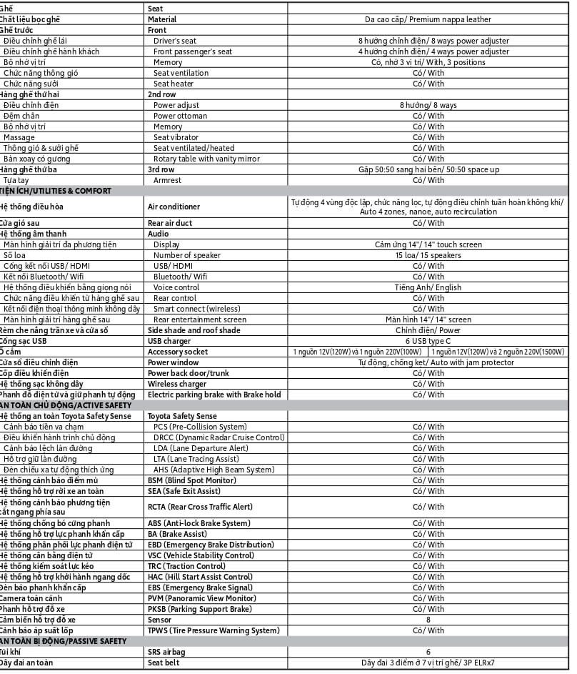 Với mong muốn đặt an toàn của khách hàng lên hàng đầu, Toyota Alphard 2023 được trang bị các tính năng an toàn tiên tiến nhất hiện nay. Trong đó, gói công nghệ an toàn chủ động Toyota Safety Sense trên cả hai phiên bản bao gồm những tính năng hỗ trợ bảo vệ tối đa cho người lái và hành khách trên xe như: Cảnh báo tiền va chạm (PCS), Cảnh báo lệch làn đường (LDA) và Hỗ trợ giữ làn đường (LTA), Đèn chiếu xa tự động thích ứng (AHS) và Điều khiển hành trình chủ động (DRCC), Hệ thống Cảnh báo điểm mù (BSM), Hệ thống Cảnh báo phương tiện cắt ngang phía sau (RCTA), Hệ thống hỗ trợ khởi hành ngang dốc (HAC), Cảnh báo áp suất lốp (TPWS), Camera 360, 8 cảm biến hỗ trợ đỗ xe và 6 túi khí,…